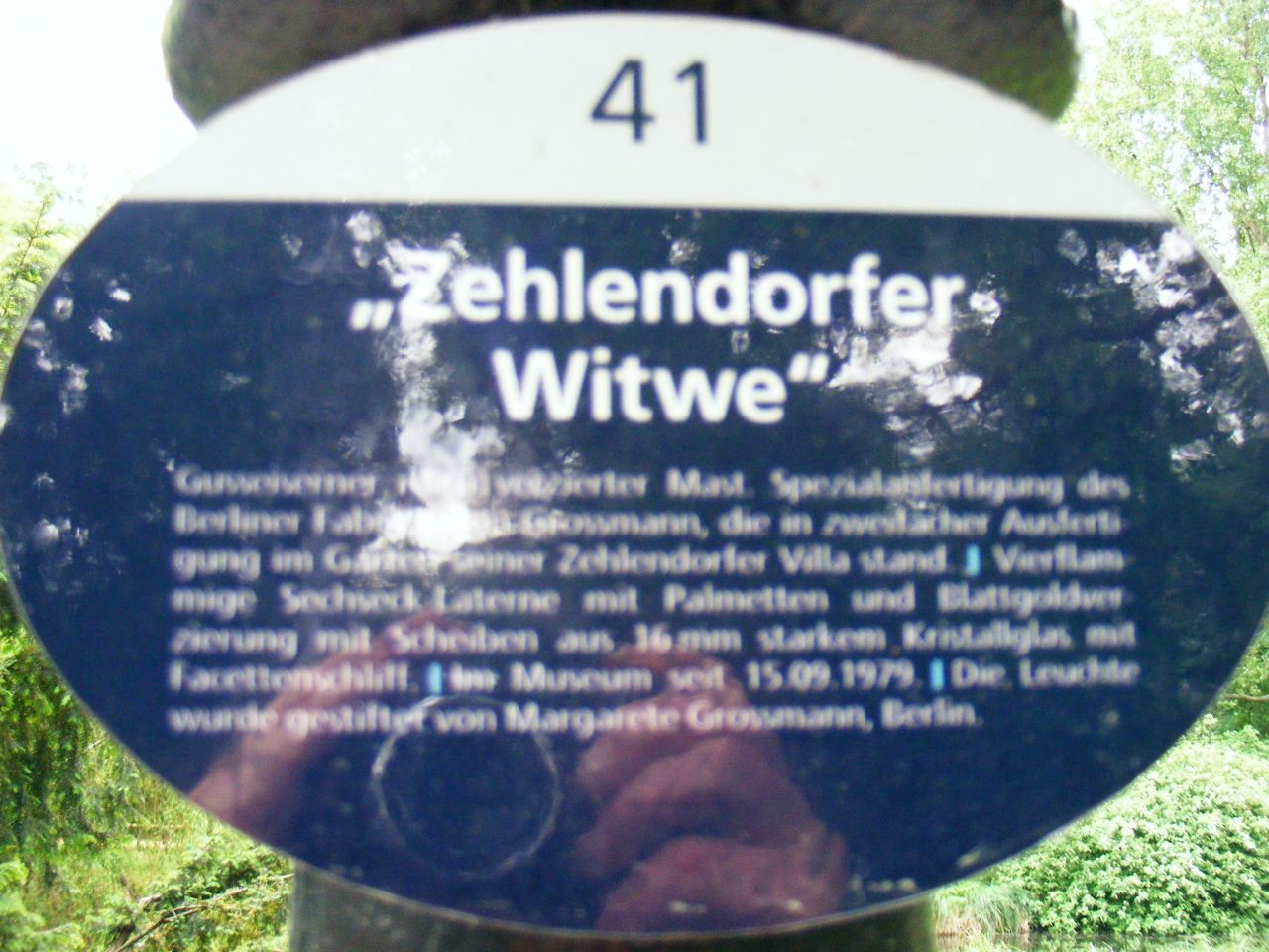 Im Berliner Gaslaternenmuseum gibt es insgesamt 90 Gaslaternen aus 25 deutschen Städten sowie aus 11 Städten anderer europäischer Länder. Einzelne Exponate haben teilweise kuriose Namen, wie zum Beispiel die Zehlendorfer Witwe (Zehlendorf:Berliner Ortsteil im Stadtbezirk Steglitz-Zehlendorf, vorher selbständiger Stadtbezirk, bis 1920 selbständige Landgemeinde vor den Toren Berlins).
