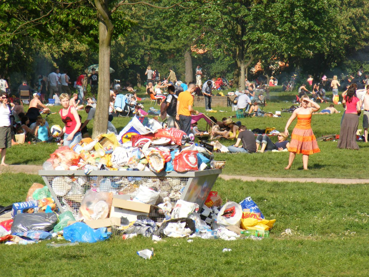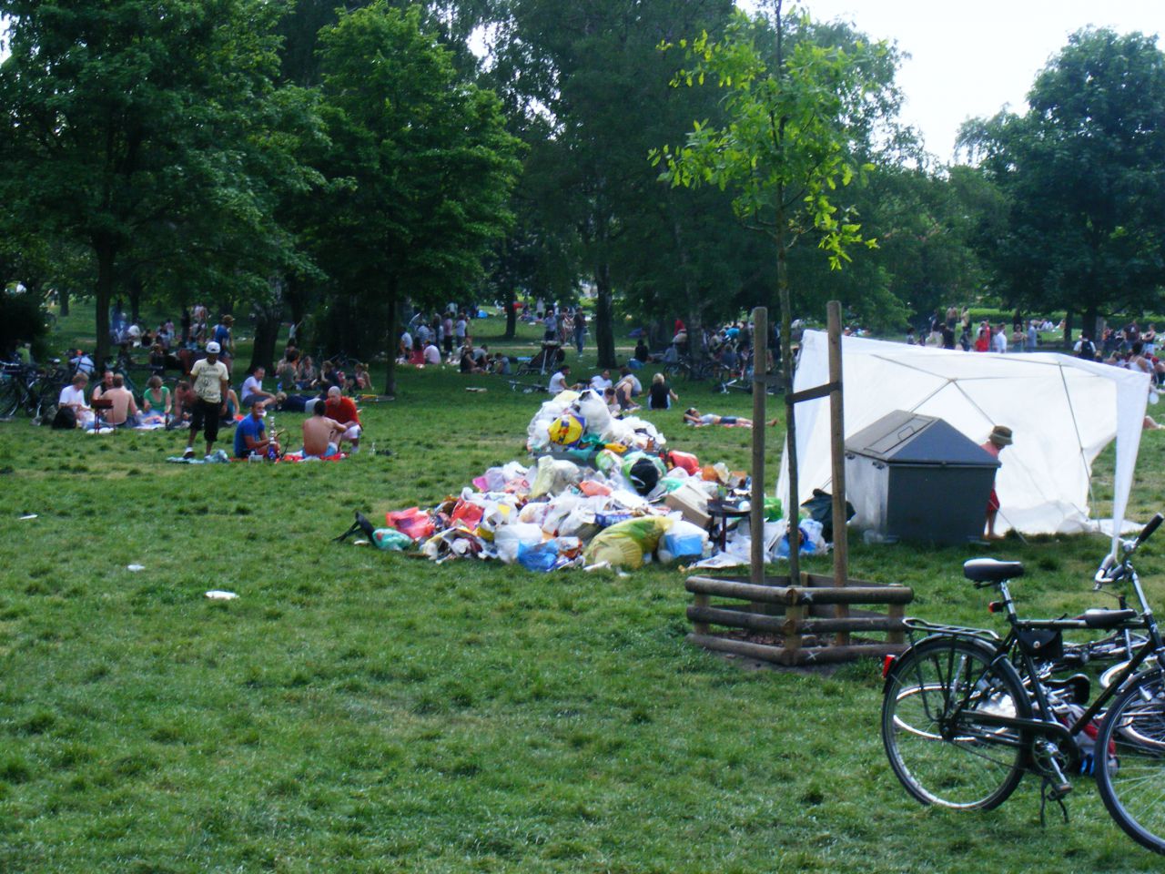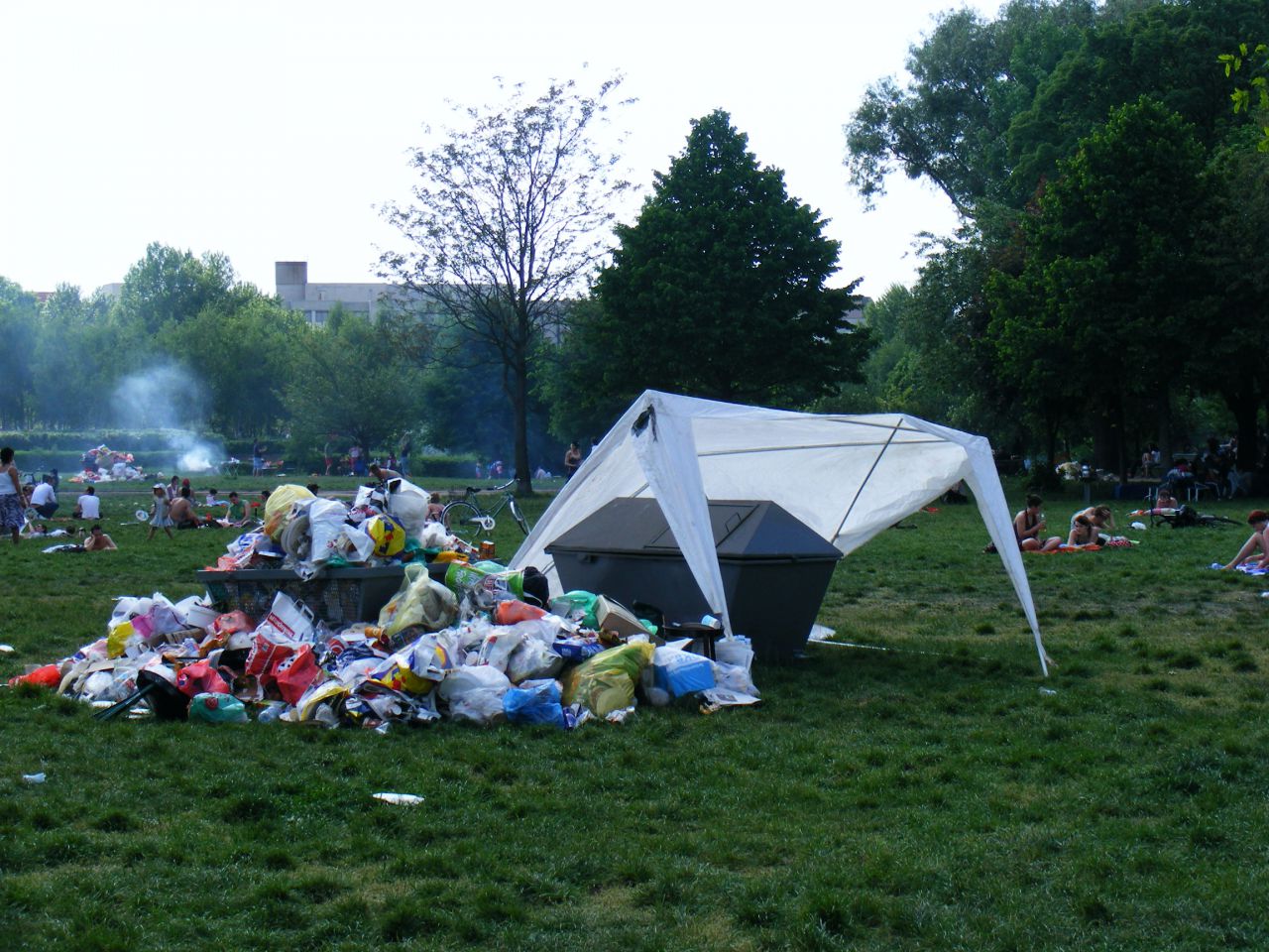 Pfingsten 2008 - der Falkplatz entwickelt sich langsam zu einem Magnet für Anwohner und Besucher der Stadt. Grillen ist, trotz der Klagen der Anwohner (noch) erlaubt. Besonders stark beansprucht ist die kleine Grünfläche während der Feiertage und bei frühsommerlichem Wetter. Grillen produziert Müll, Menschen produzieren Müll.