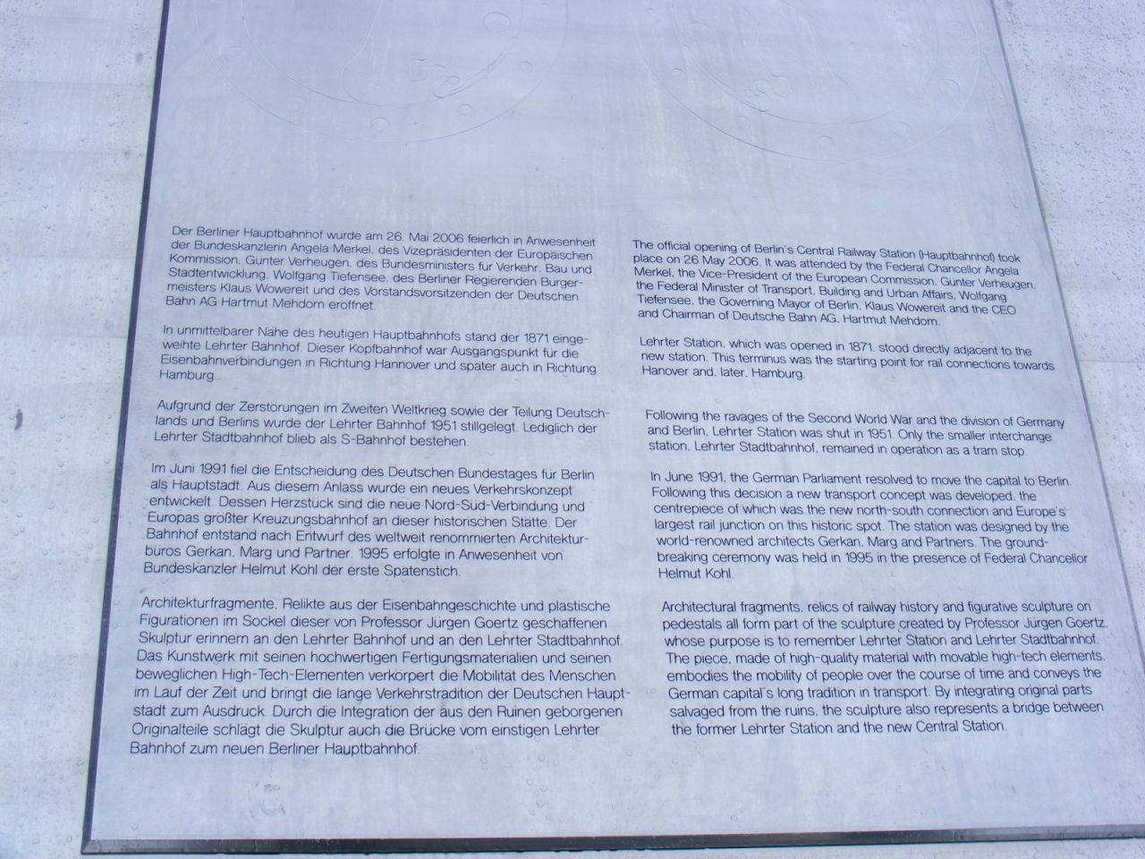Der Berliner Hauptbahnhof wurde in der heutigen Form im Mai 2006 eingeweiht. Früher befand sich in dieser Gegend der Lehrter Bahnhof bzw. der Lehrter Stadtbahnhof. An der Nordseite des neuen Bahnhofsgebäudes befindet sich eine Skulptur, die ich sehr interessant finde.